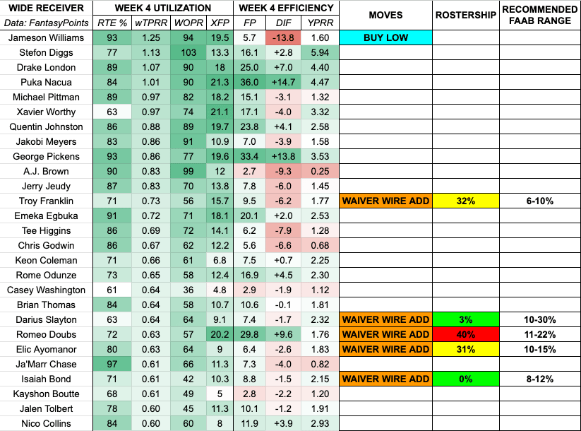 Buy Low on Jameson Williams - JaMoâs Week 4 role was awesome, but he only has 5.7 fantasy points (versus 19.5 expected points) to show for it. His 29.6% target share and 8 targets were season-highs, yet his 2-40-0 statline likely has his fantasy managers miffed. Iâd be buying JaMo low with the hopes that his Week 4 utilization is a sign of things to come.