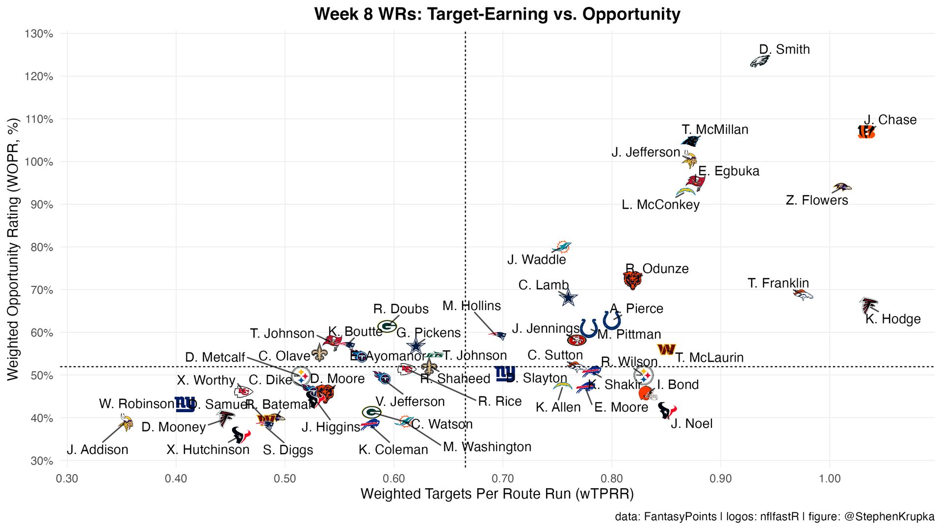 wTPRR - (Weighted Targets Per Route Run) - Targets Per Route Run but with air yards layered in. A metric created by Ben Gretch of Stealing Signals. My favorite metric for analyzing pass-catcher opportunity.