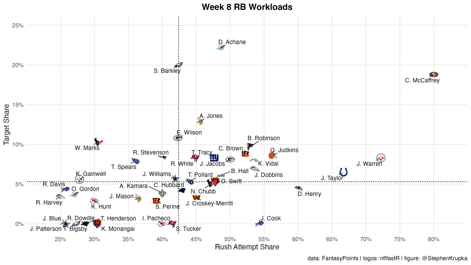 Warren scored just 9.8 fantasy points this week, but he has reclaimed the featured running back role in Pittsbughās offense, handling 72.2% of the Steelersā rushing attempts while also earning an 8.3% target share. On the season, Warren is 8th among all running backs in rush attempt share (62.4%) and 10th in target share (11.7%), yet ranks as just the RB18 in fantasy points per game (13.6). Per PFFās Strength Of Schedule metric, Pittsburgh has the most favorable schedule for fantasy running backs over the next six weeks, so Iād be buying low on him coming off his underwhelming Week 8 performance.