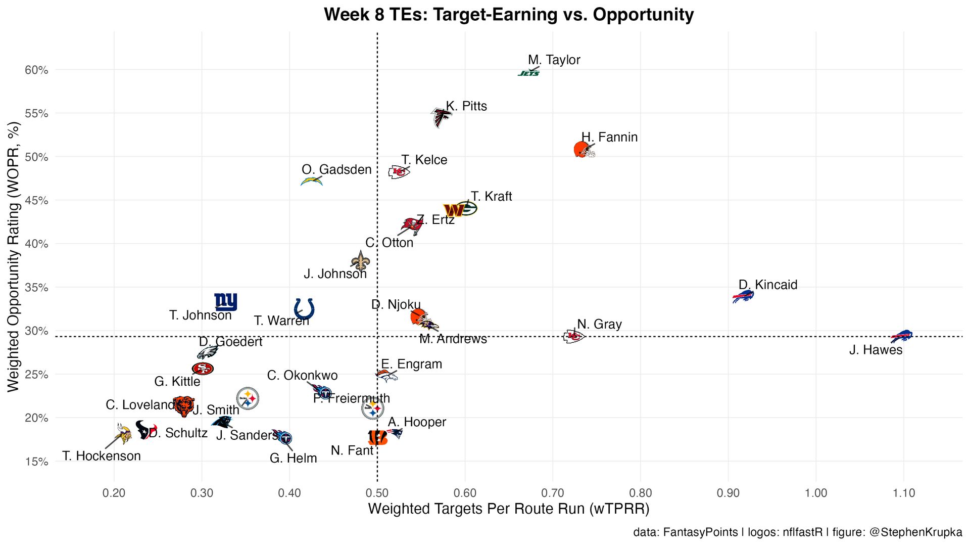 Iāve been begging for the Colston Loveland breakout game, and we didnāt get it in Week 8. However, the 10th overall pick did log season/career-highs in snap share (80.6%) route share (75.6%), and believe it or not, fantasy points (just 6.8), in Cole Kmetās absence. With Kmet week-to-week, Loveland could get another shot as Chicagoās featured tight end in Week 9, facing a Bengals defense that ranks as the best matchup in the league for fantasy tight ends, according to Establish The Runās Defense vs. Position Rankings. Given Lovelandās talent profile, I would not be surprised if he plays well and retains the starting job moving forward, even when Kmet returns to health. Iād be stashing Loveland this week before itās too late.